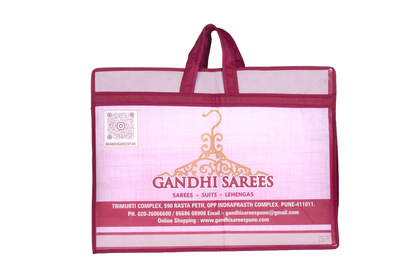 • Digital Engagement: Includes a clear QR code and Instagram handle **@GANDHISAREESPUNE** on the front, encouraging digital interaction and social media connection with the customer base.
