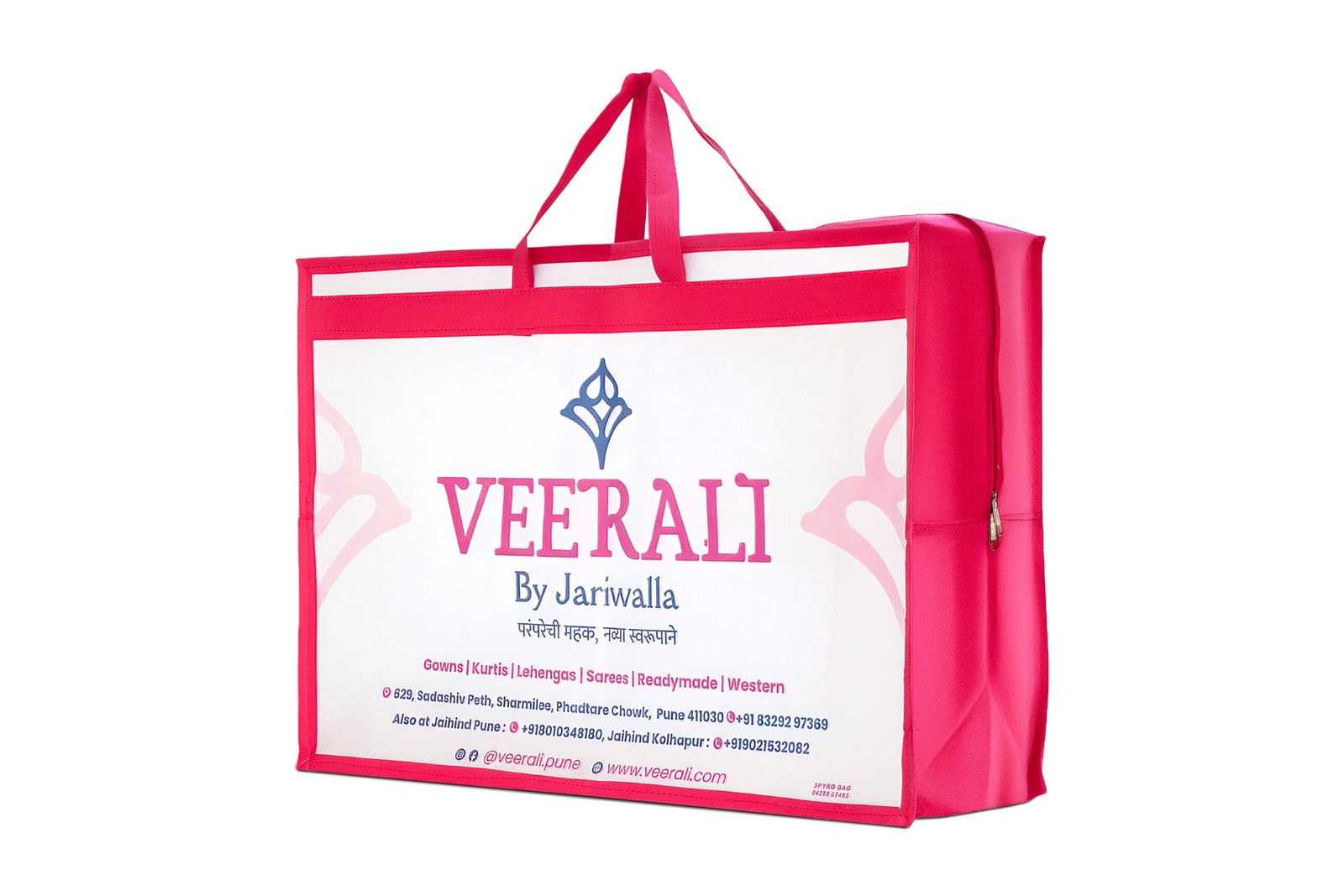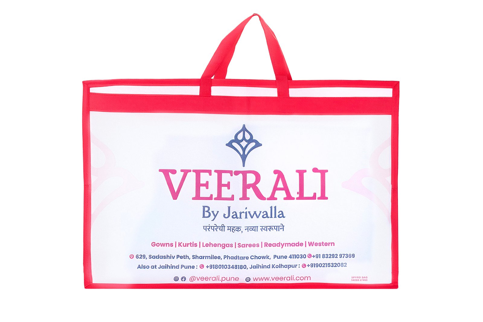 This distinct non-woven bag is designed to carry the exquisite range of traditional and contemporary apparel offered by **VEERALI By Jariwalla**. The design, which includes the Marathi tagline “???????? ???, ????? ?????????” (The fragrance of tradition, in a new form), reflects a blend of heritage and modern style.